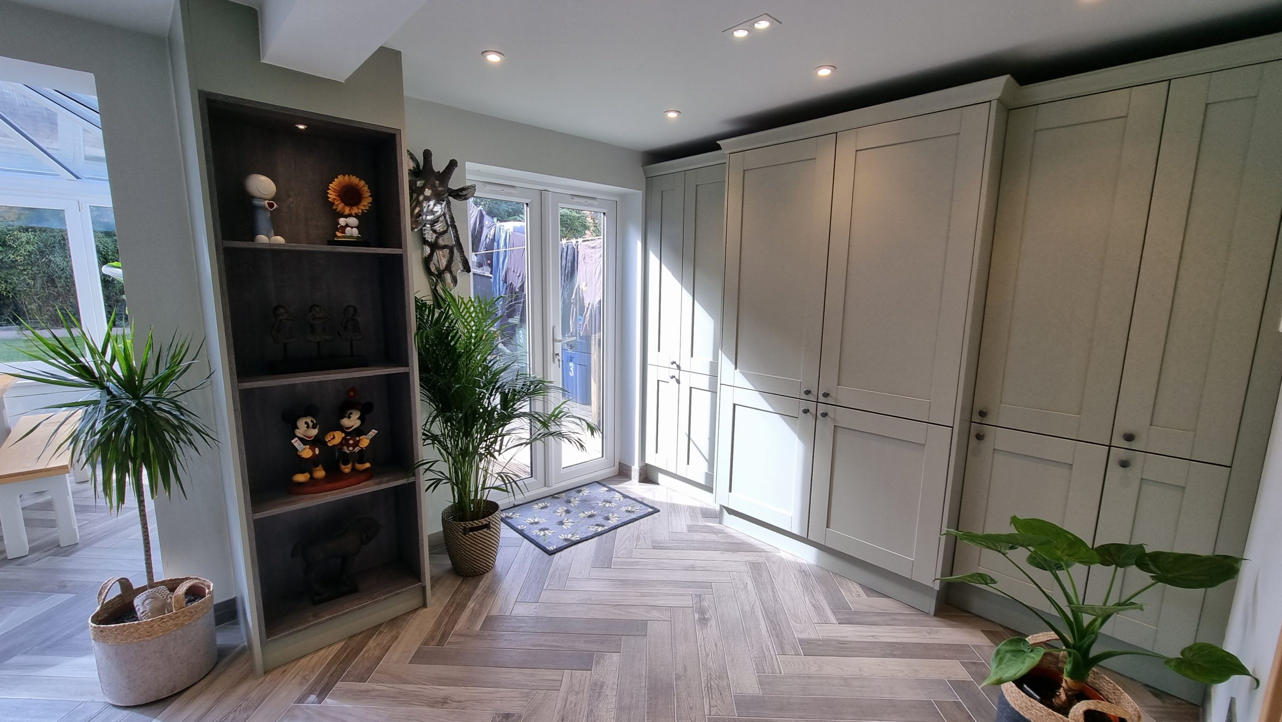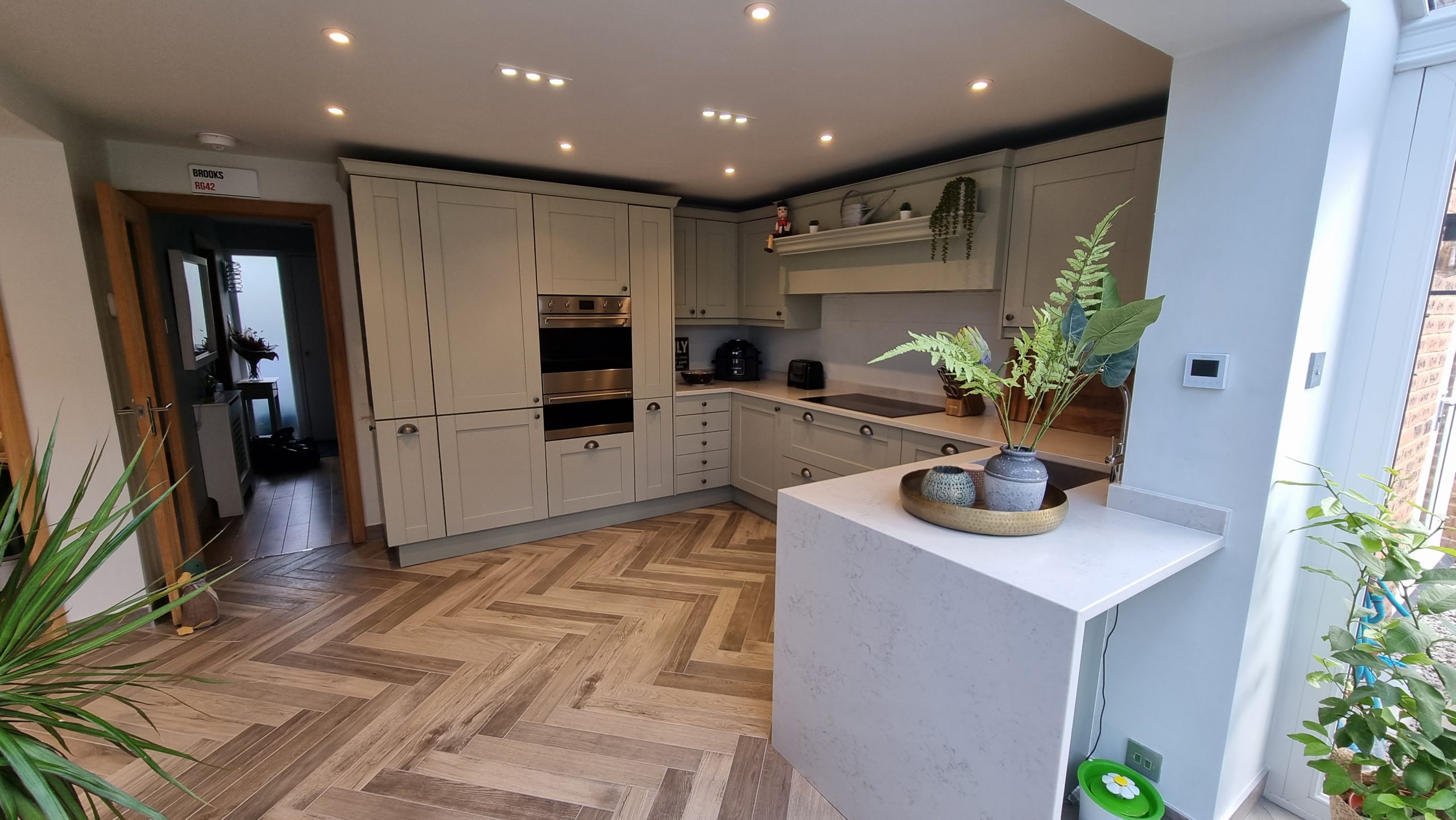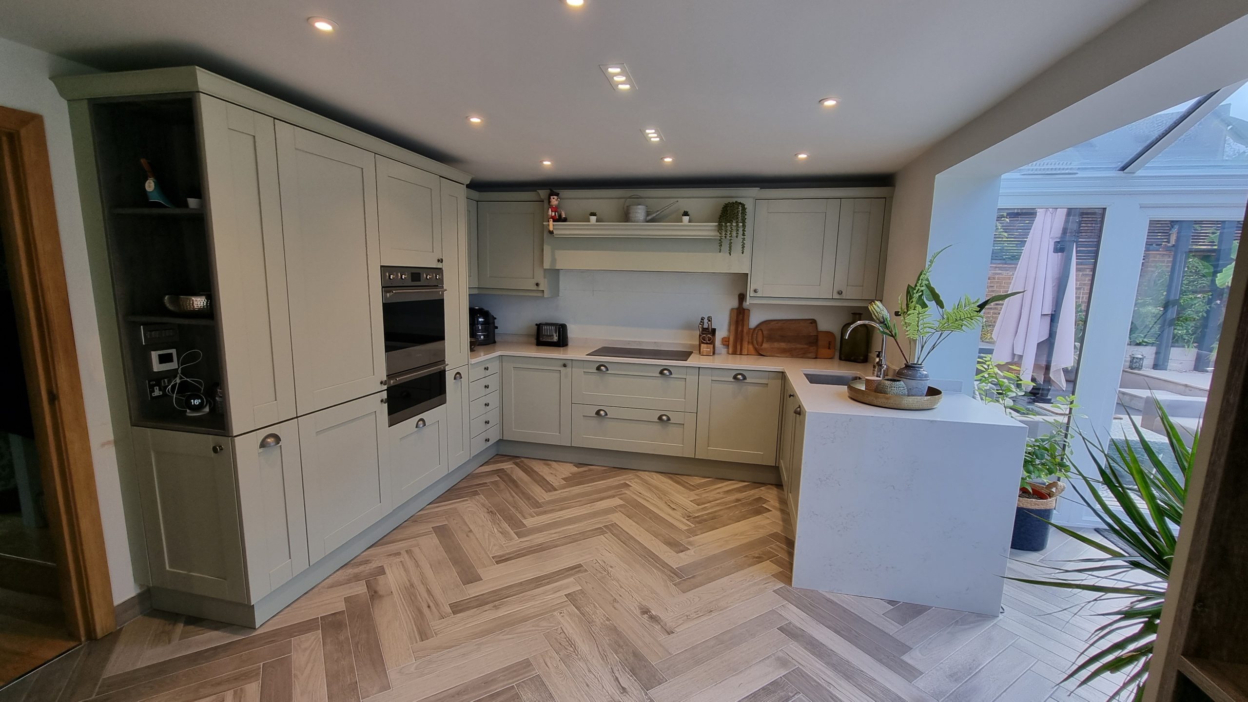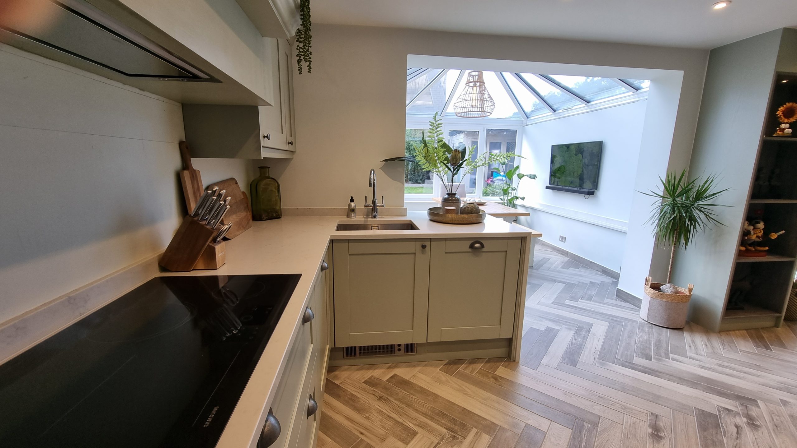 Sometimes less is more, and for this particular project the client asked us to focus on floor space. The family prefer to congregate around the large table in the conservatory as the main socail space and use the kitchen area purely for cooking. Using a small peninsular, we created a sink area and extra worktop space while keeping the conservatory accesible with a large walkthrough area, leaving plenty of space in front of the kitchen and keeping it accesible. Matching Quartz worktop installed around the edges of the conservatory bring both rooms together under one theme.