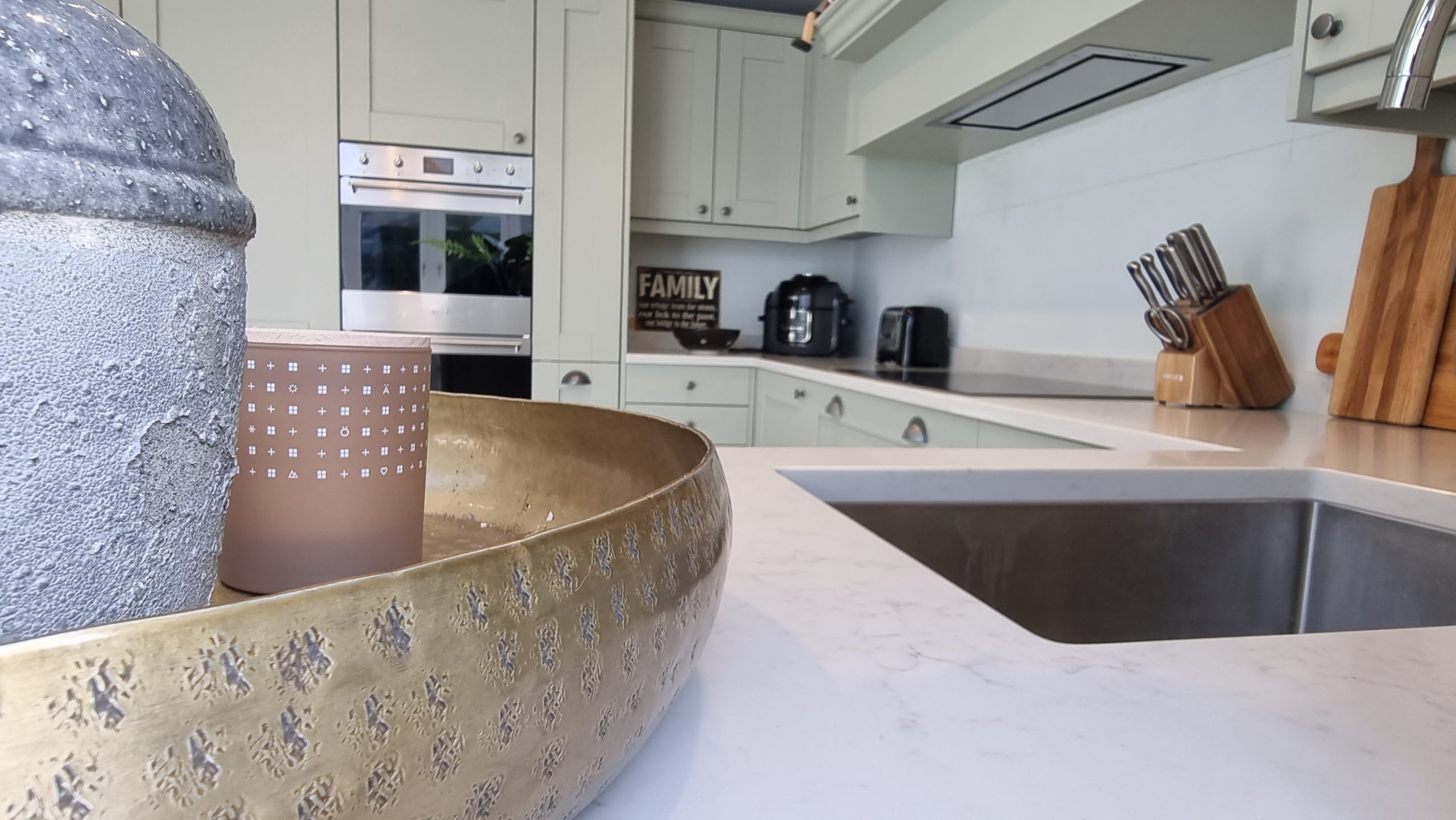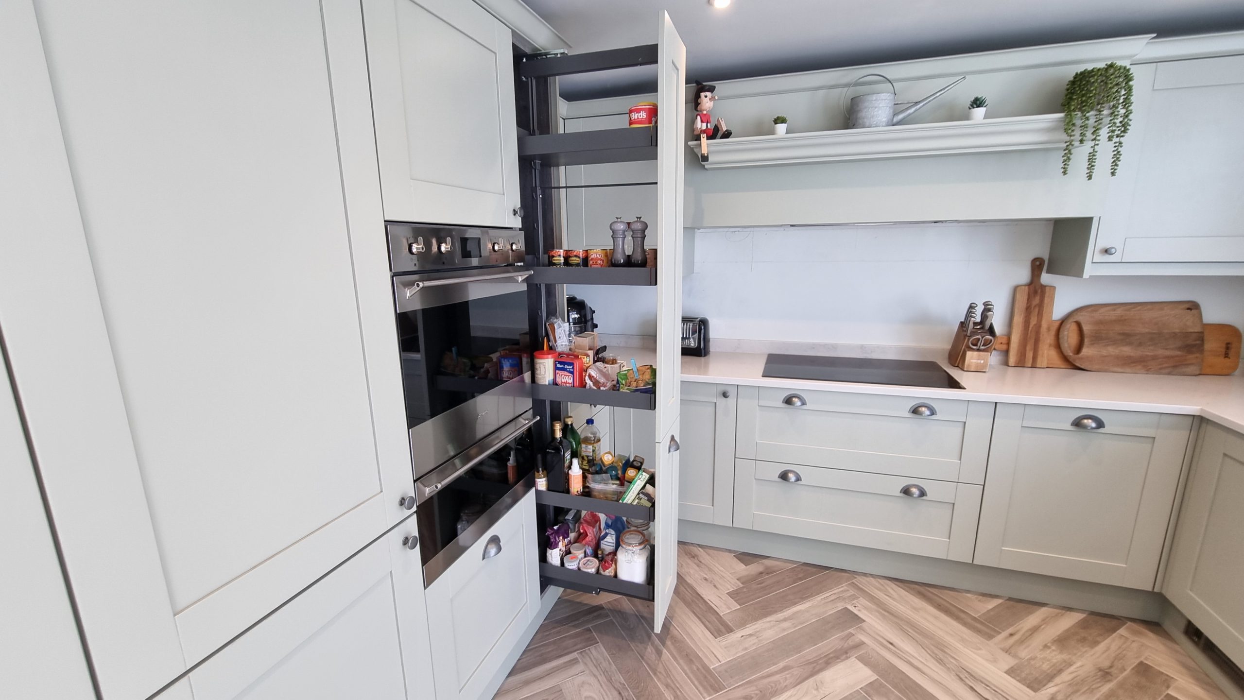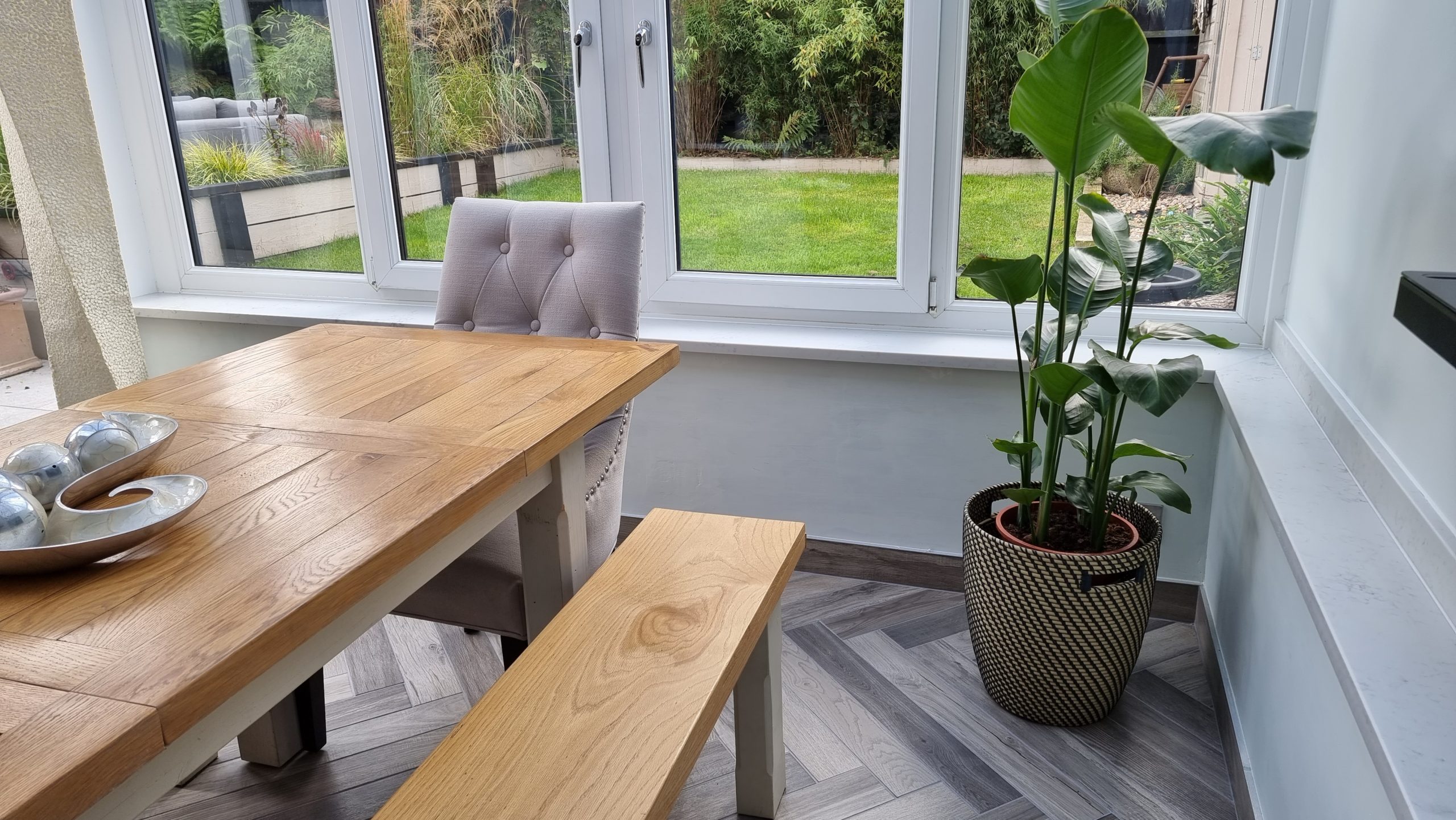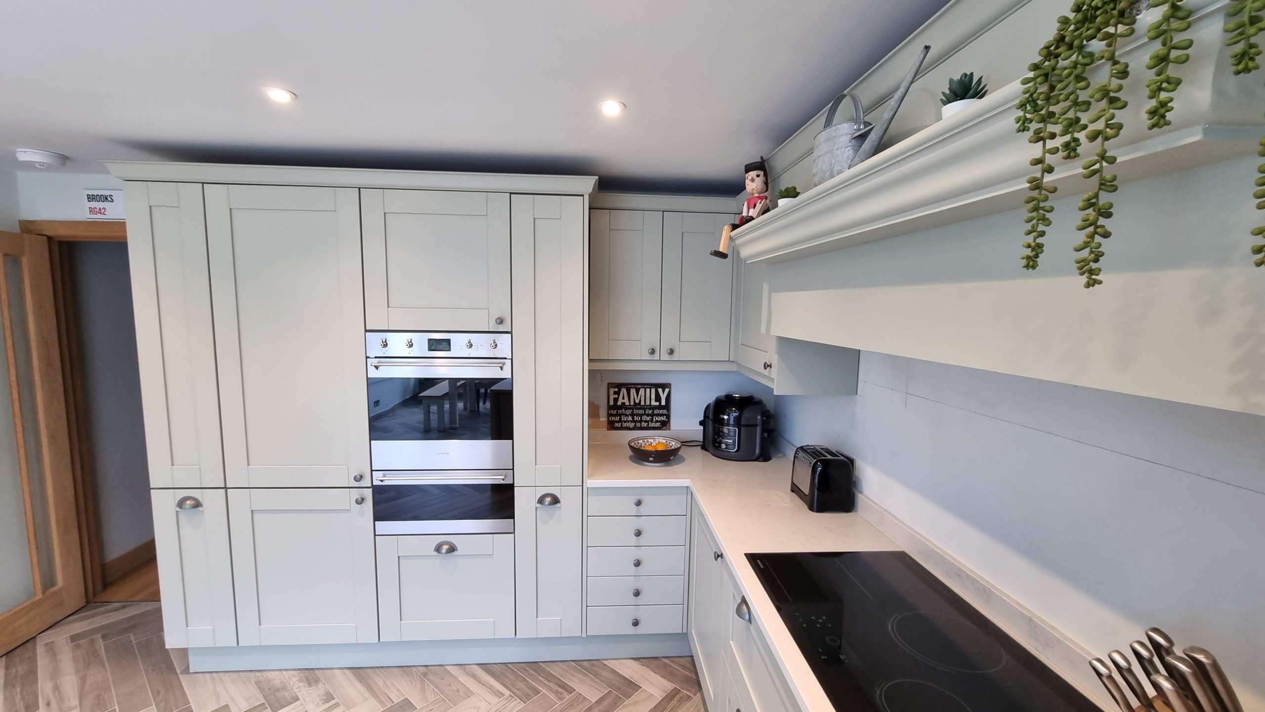 Sometimes less is more, and for this particular project the client asked us to focus on floor space. The family prefer to congregate around the large table in the conservatory as the main socail space and use the kitchen area purely for cooking. Using a small peninsular, we created a sink area and extra worktop space while keeping the conservatory accesible with a large walkthrough area, leaving plenty of space in front of the kitchen and keeping it accesible. Matching Quartz worktop installed around the edges of the conservatory bring both rooms together under one theme.