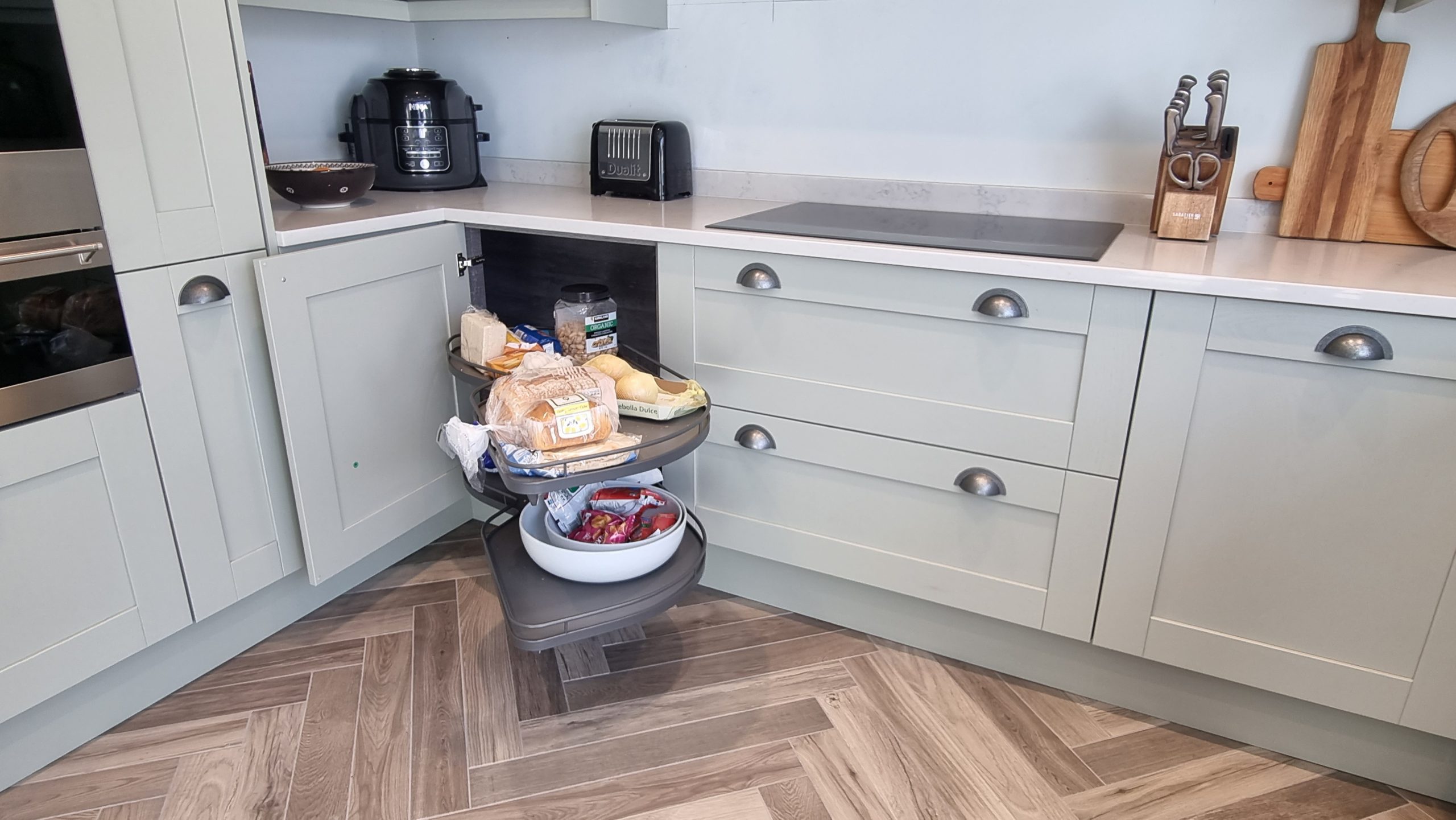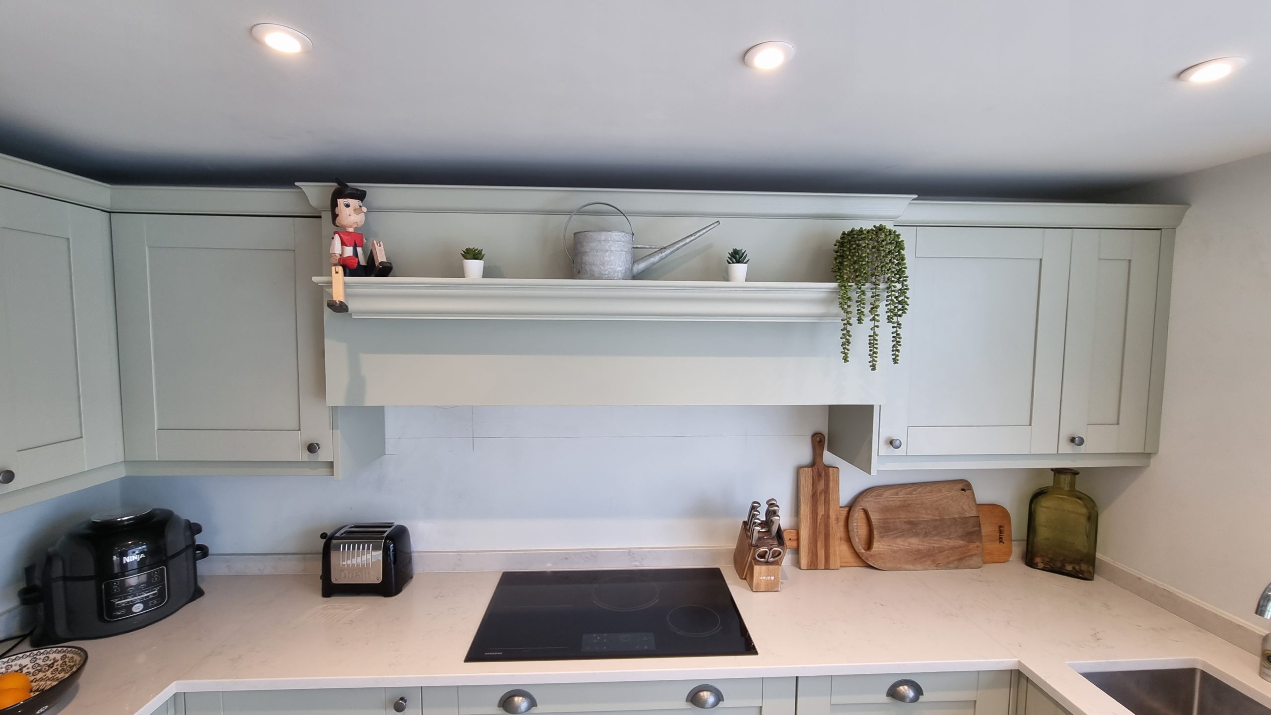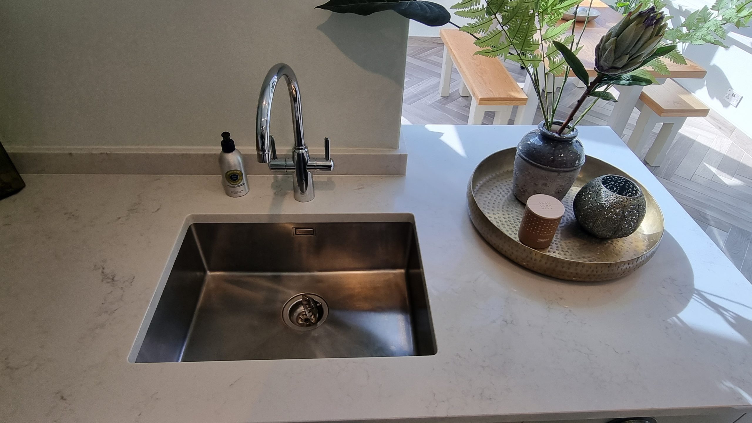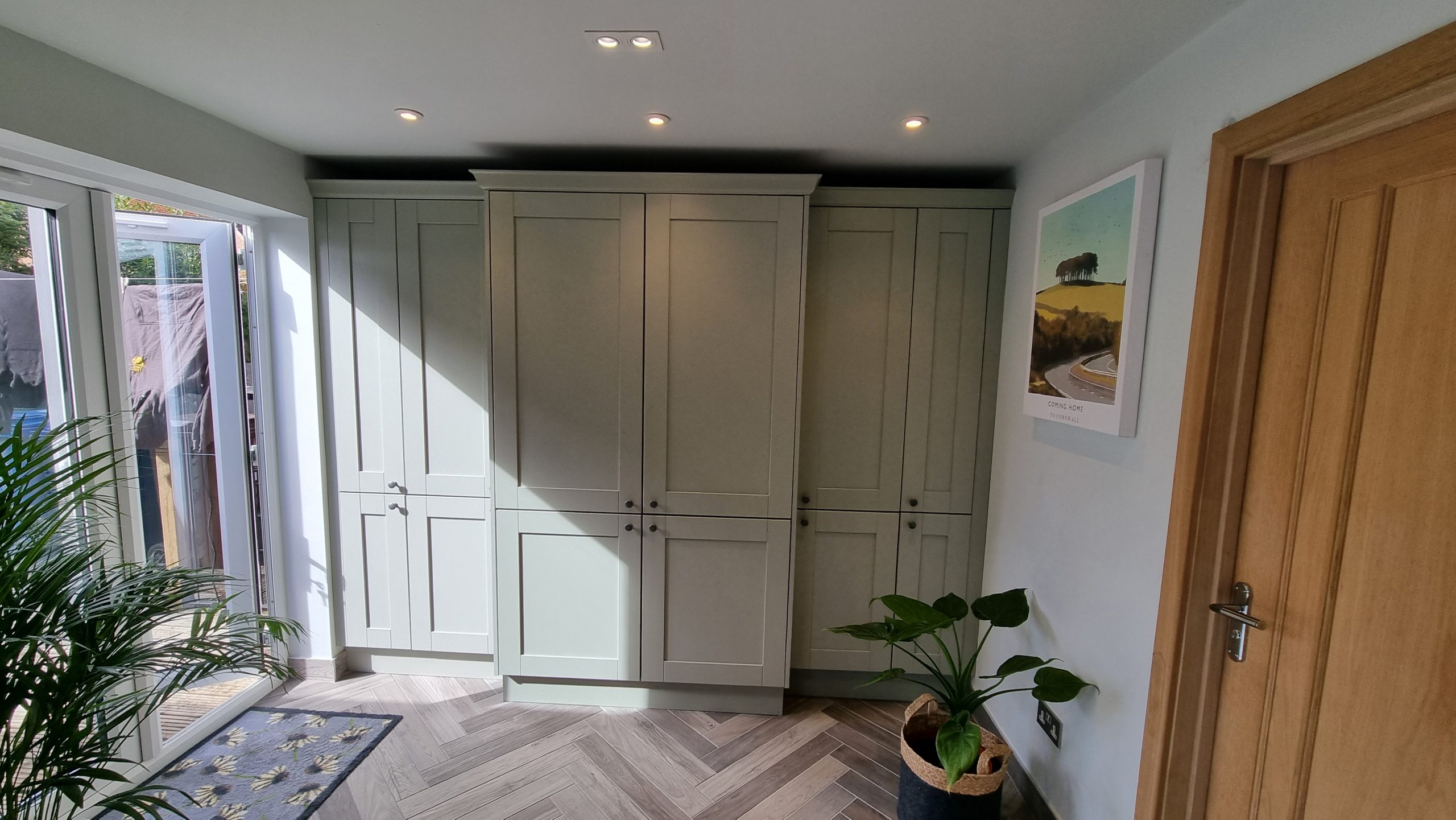 Sometimes less is more, and for this particular project the client asked us to focus on floor space. The family prefer to congregate around the large table in the conservatory as the main socail space and use the kitchen area purely for cooking. Using a small peninsular, we created a sink area and extra worktop space while keeping the conservatory accesible with a large walkthrough area, leaving plenty of space in front of the kitchen and keeping it accesible. Matching Quartz worktop installed around the edges of the conservatory bring both rooms together under one theme.