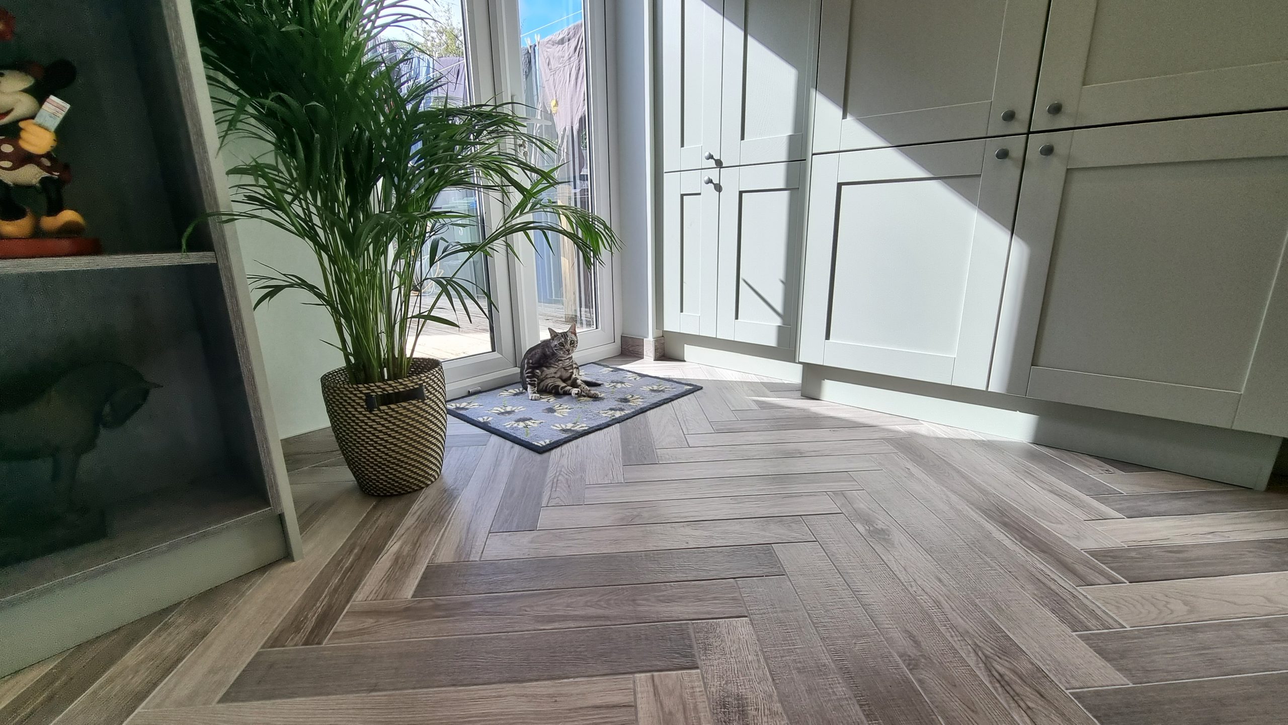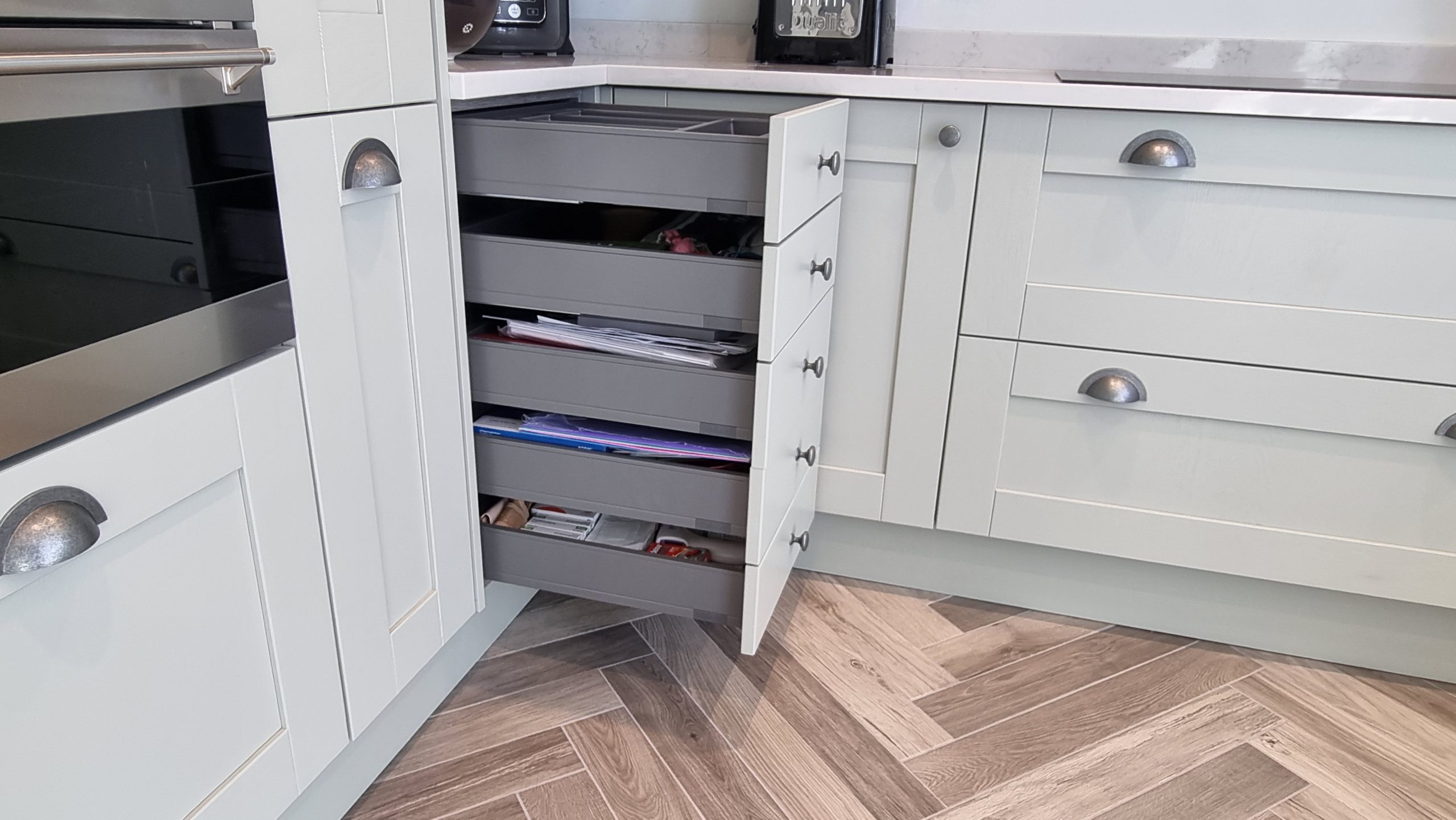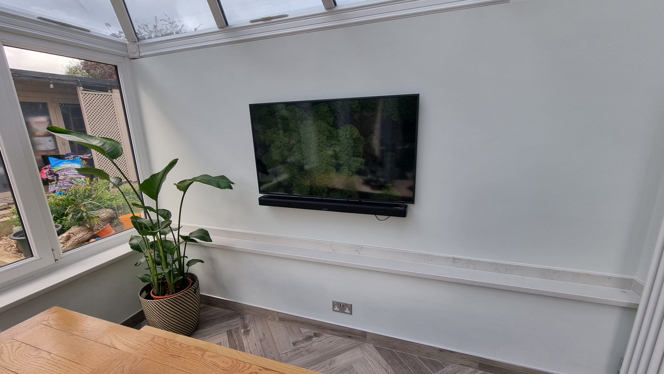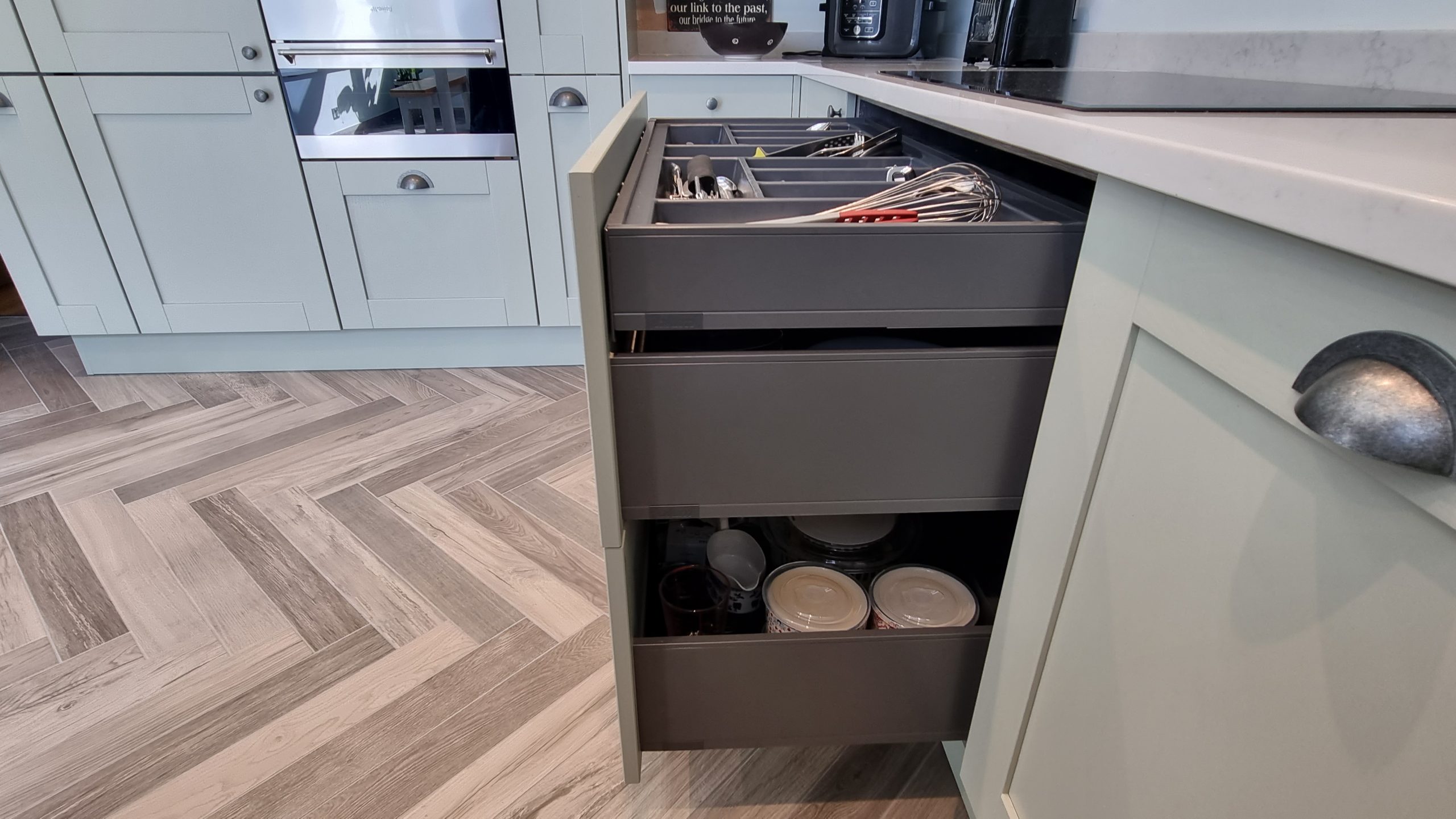 Sometimes less is more, and for this particular project the client asked us to focus on floor space. The family prefer to congregate around the large table in the conservatory as the main socail space and use the kitchen area purely for cooking. Using a small peninsular, we created a sink area and extra worktop space while keeping the conservatory accesible with a large walkthrough area, leaving plenty of space in front of the kitchen and keeping it accesible. Matching Quartz worktop installed around the edges of the conservatory bring both rooms together under one theme.