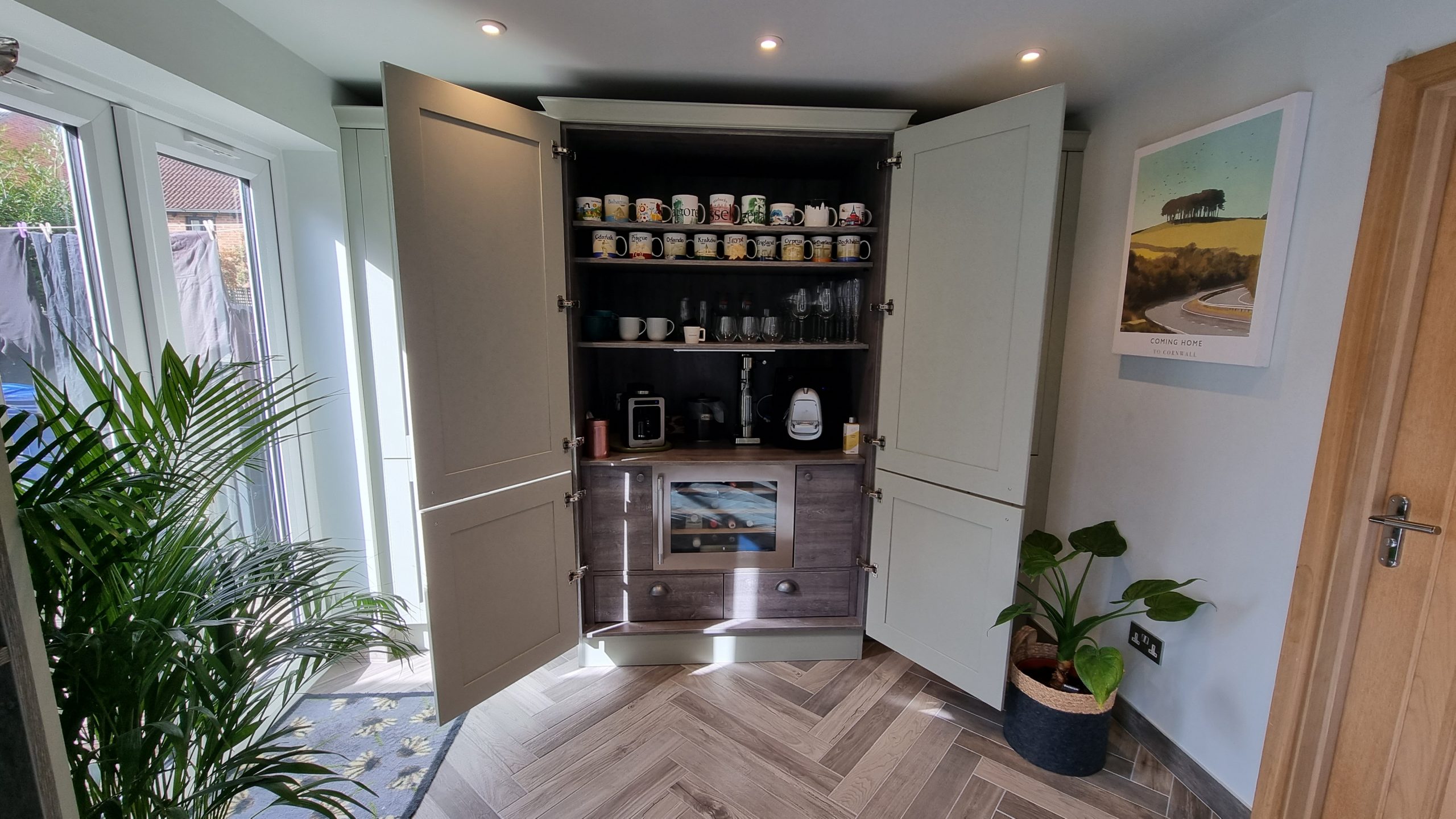 Opposite the main kitchen the space was used to create further storage, with space for a small table and some seating to be added at a later date. The central larder was designed to compliment this as a drinks cabinet to house a wine cooler and further storage, creating a small coffee shop area for the family to read and relax in.